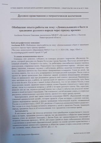 Сертификат о публикации в научно – образовательном журнале «Вестник дошкольного образования» материала по теме: Обобщение педагогического опыта «Дошкольникам о быте и традициях русского народа через призму времен» 2024г